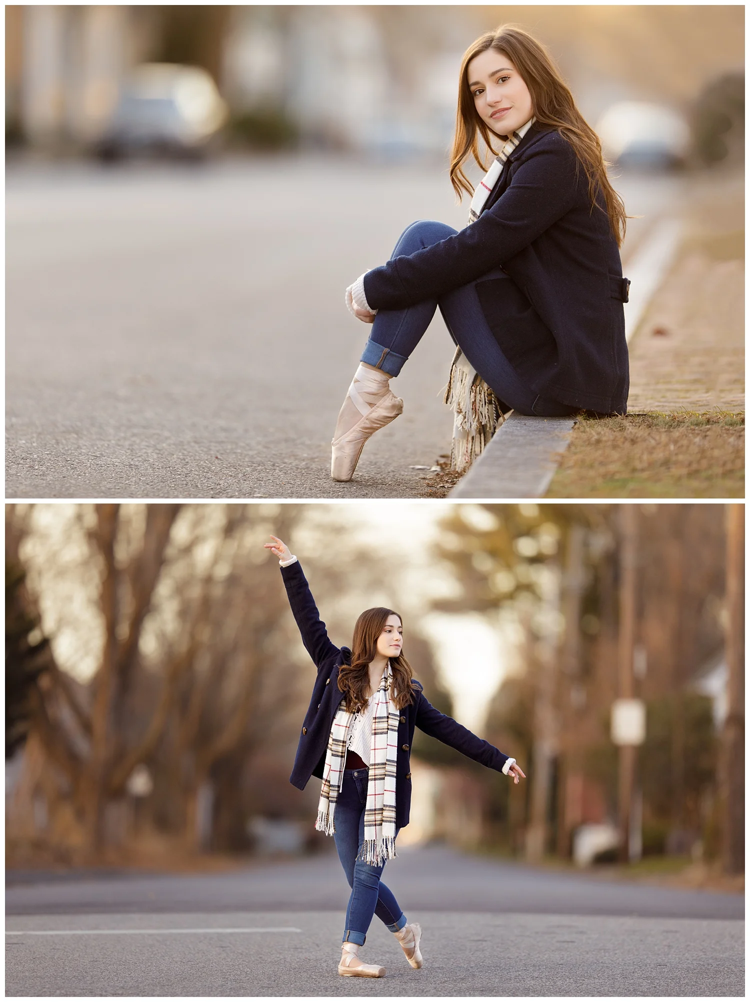 It’s not all the time that you see someone on pointe on a local sidewalk, but recently that’s something I got to see (and photograph). My lovely friend Dayle Embleton, who dances professionally in LA, came home for the holidays. Not only did I get to see her, but I got to photograph her. This girl always has some ideas! It’s always a joy to photograph her, and as a RI family photographer, it’s been awesome to see her talent ever increase over the years. So we put our brains together and decided to do a late afternoon session on the sidewalks and streets of Wickford.
