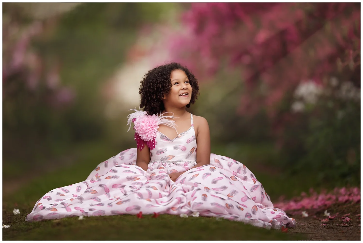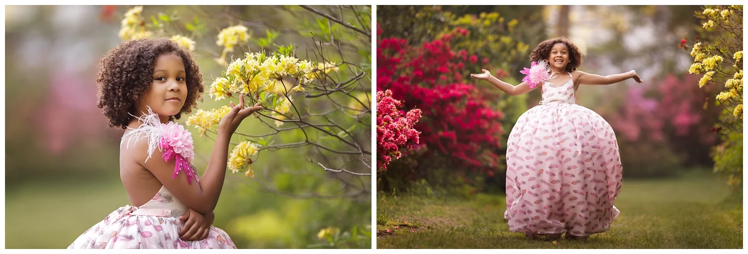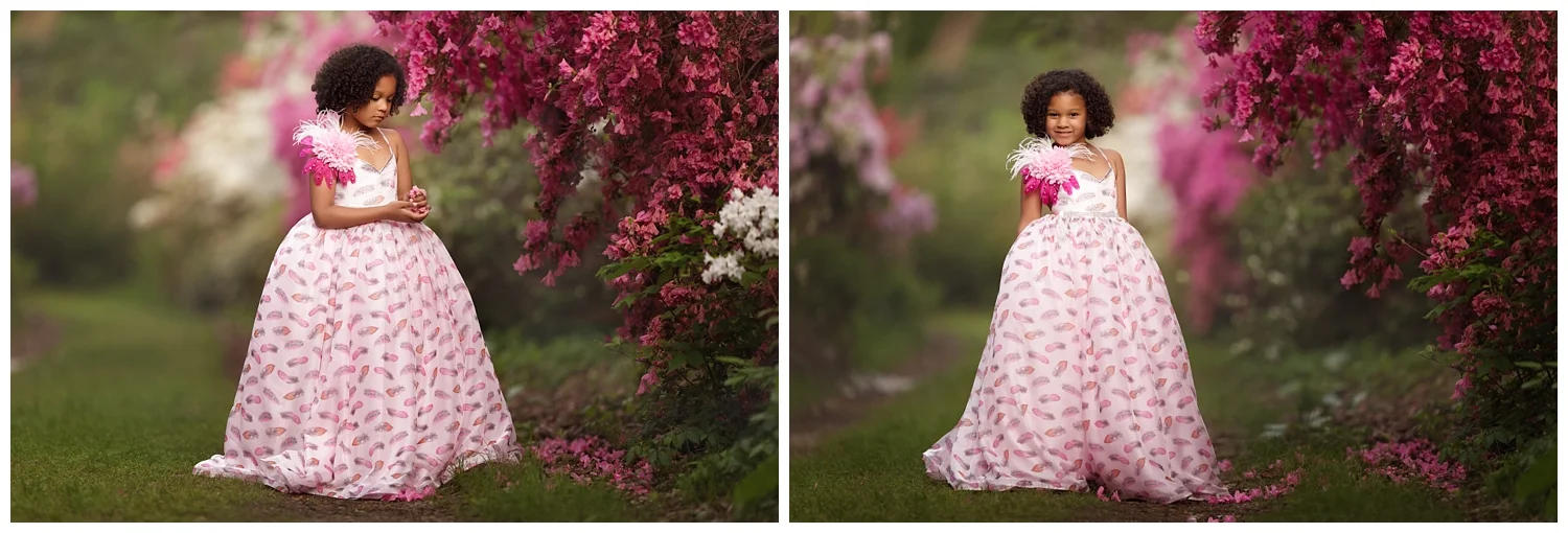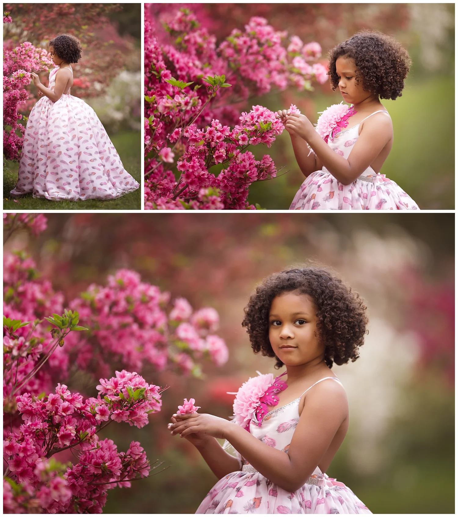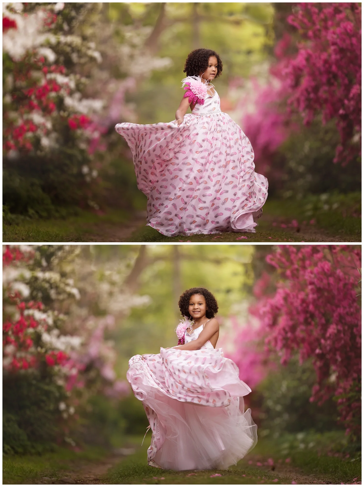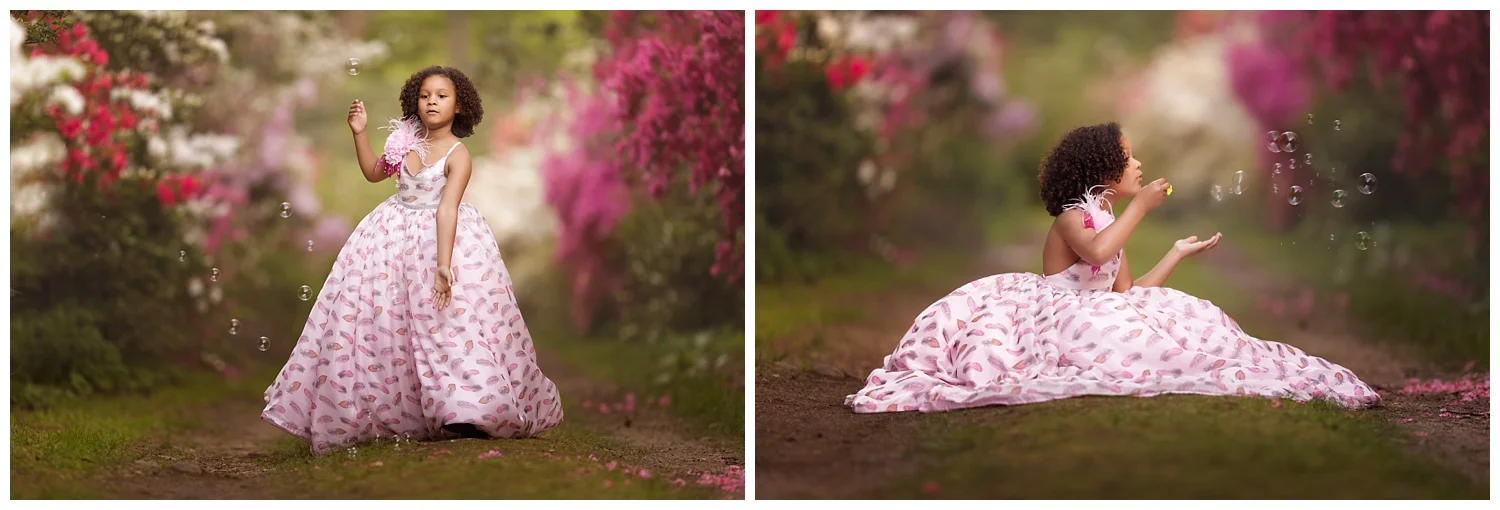 Until now! Last month, I had a princess session with the lovely Miss E. She was the first to model another one of my new princess dresses for this season. It's one of my favorites for the littler princesses! Miss E was beautiful, the azaleas were beautiful, and the weather was beautiful. It was a perfect combination. We wandered around the grounds amongst all the colors and had fun, as usual: jumping, spinning, and blowing bubbles (and flowers!) Miss E has the best personality ever and kept me laughing. She let me know that when she gets her license, she will be getting a minivan and driving to the mall. I love that she has goals! And minivans have a ton of storage space!